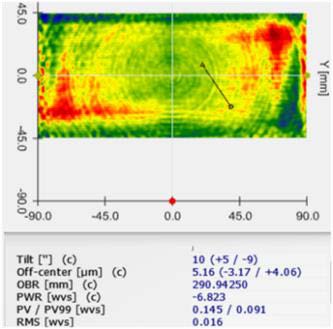 通过加工后有效口径内 Luphoscan 检测精度PV=0.145 λ , PV 99 =0.091 λ ,RMS=0.016 λ,粗糙度达到Rq=0.35nm。